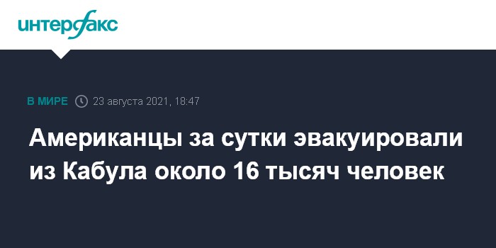 Москва. 23 августа. INTERFAX.RU - Около 16 тысяч человек смогли покинуть Кабул за последние сутки благодаря миссиям ВВС США. Об этом сообщил в понедельник на брифинге в Пентагоне генерал Хэнк Тэйлор, отвечающий в американском оборонном ведомстве за логистические операции.