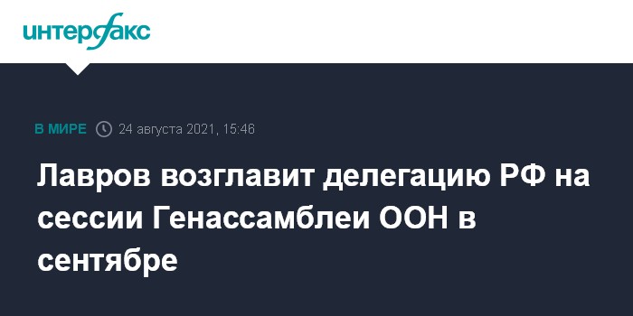Москва. 24 августа. INTERFAX.RU - Глава МИД РФ Сергей Лавров возглавит российскую делегацию на сегменте высокого уровня 76-й сессии Генеральной ассамблеи ООН, которая пройдет 21-27 сентября в Нью-Йорке.