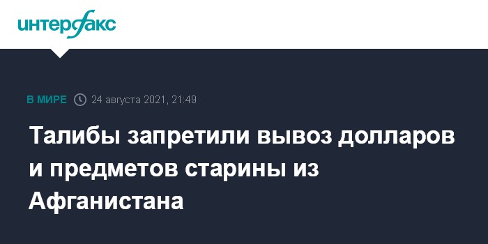 Москва. 24 августа. INTERFAX.RU - Радикальное исламское движение "Талибан" (запрещенная в России террористическая организация) издало распоряжение, в соответствии с которым запрещено вывозить из страны доллары и антиквариат.