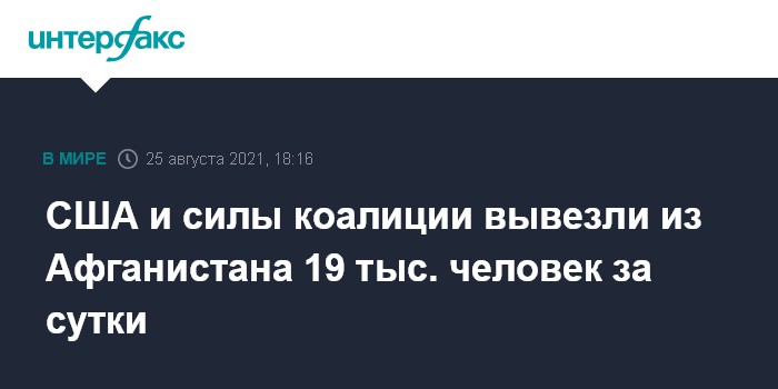 По его словам, "всего за прошедшие сутки из аэропорта Кабула было совершено 90 рейсов, это означает, что примерно 19 тыс. человек за последние сутки безопасно покинули Афганистан".