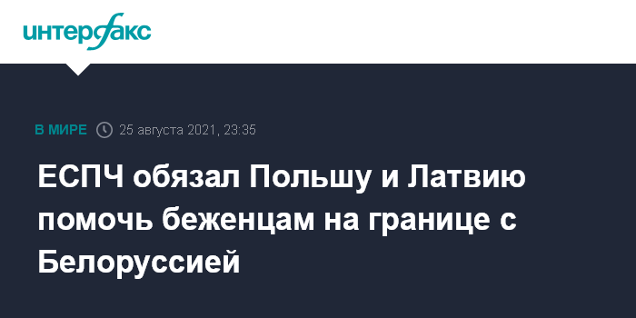 Москва. 25 августа. INTERFAX.RU - Европейский суд по правам человека (ЕСПЧ) потребовал от Польши и Латвии оказать помощь мигрантам, находящимся на границах стран с Белоруссией. Об этом говорится в заявлении ЕСПЧ, опубликованном в среду 25 августа на официальном сайте организации.