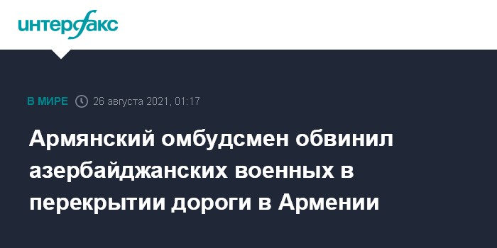 Москва. 26 августа. INTERFAX.RU - Несколько десятков азербайджанских военных перекрыли дорогу, ведущую из Гориса в Капан, в Сюникской области Армении, сообщает армянский омбудсмен Арман Татоян.