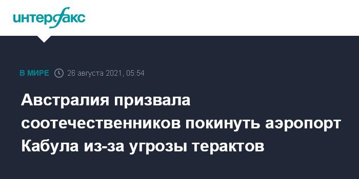Ранее Великобритания и США предупредили своих граждан об угрозе безопасности в аэропорту Кабула. Обе страны выпустили предупреждения поздно вечером в среду, поскольку тысячи людей все еще ждут внутри и снаружи аэропорта, ожидая вылета. Более 82 тыс. человек улетели из Кабула после того, как столица Афганистана попала в руки талибов (движение "Талибан" запрещено в РФ). Страны спешат эвакуировать людей к крайнему сроку 31 августа.