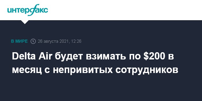 Москва. 26 августа. INTERFAX.RU - Американская авиакомпания Delta Air Lines с 1 ноября начнет взимать ежемесячно по $200 с сотрудников, которые не привились от коронавируса. Как пишет The Wall Street Journal, об этом говорится в письме гендиректора компании Эда Бастиана сотрудникам.