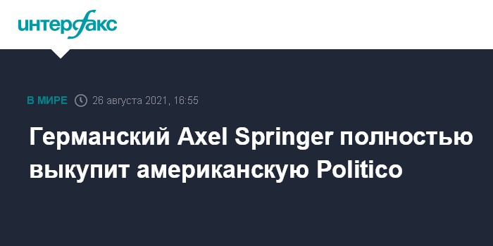Москва. 26 августа. INTERFAX.RU - Германский медиаконцерн Axel Springer сообщил, что полностью выкупит Politico - американскую медиакомпанию, которая занимается политической журналистикой.