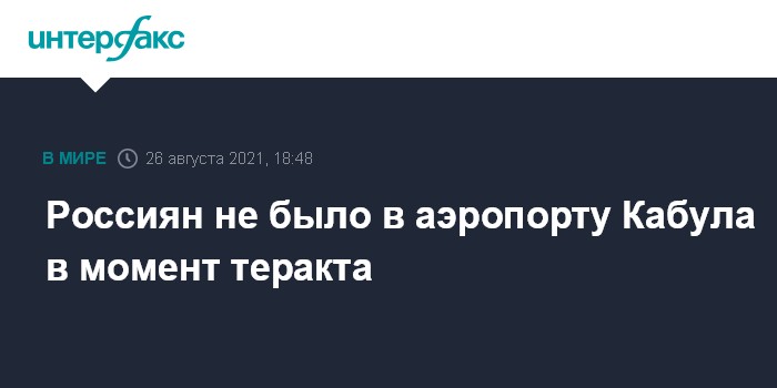 Москва. 26 августа. INTERFAX.RU - Россиян не было в аэропорту Кабула в момент террористической атаки, осуществленной террористом-смертником ранее в четверг, заявила официальный представитель МИД РФ Мария Захарова.