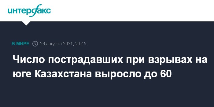 Москва. 26 августа. INTERFAX.RU - В больницу с ранениями в результате взрывов на территории воинской части в Жамбылской области на юге Казахстана доставлены 60 человек, сообщила пресс-служба администрации региона.