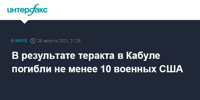 Москва. 26 августа. INTERFAX.RU - Не менее 10 военнослужащих США, включая морских пехотинцев, были убиты в четверг в результате теракта у международного аэропорта Кабула, сообщил телеканал Fox News со ссылкой на представителей властей США.
