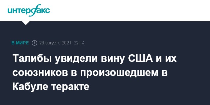 Москва. 26 августа. INTERFAX.RU - Движение "Талибан" (террористическая организация, запрещена в РФ) считает, что в происшедшем в аэропорту Кабула теракте есть вина США и их союзников.