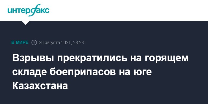 Москва. 26 августа. INTERFAX.RU - Взрывы прекратились на складе боеприпасов на юге Казахстана, сообщила пресс-служба Минобороны Казахстана. Там полагают, что продолжающийся шестой час пожар на воинском складе на юге Казахстана мог быть вызван сгоранием тротила.