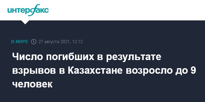 Москва. 27 августа. INTERFAX.RU - Число погибших в результате взрывов на военном складе в Казахстане (в Жамбылской области, на юге страны) возросло до девяти человек, сообщила пресс-служба МЧС республики.