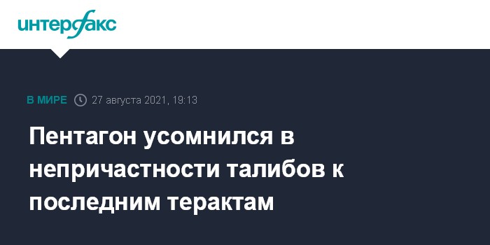 Москва. 27 августа. INTERFAX.RU - В Пентагоне совсем не уверены в непричастности движения "Талибан" (запрещено в России) к последним терактам у аэропорта Кабула, заявил на брифинге пресс-секретарь американского военного ведомства Джон Кирби.