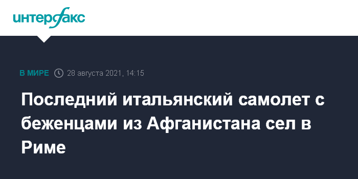 Москва. 28 августа. INTERFAX.RU - В аэропорту Рима приземлился самолет ВВС Италии с 58 афганскими беженцами на борту, это последний эвакуационный рейс Италии из Афганистана, сообщает Associated Press.