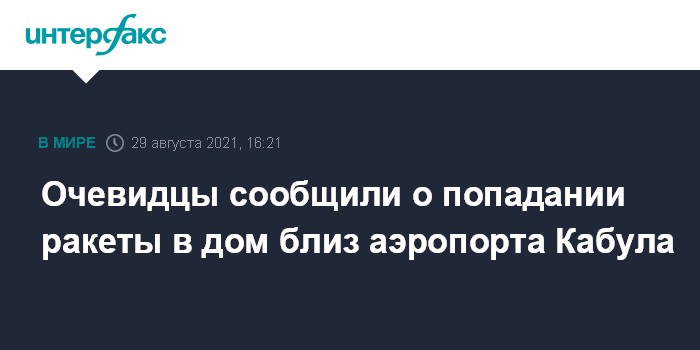 Москва. 29 августа. INTERFAX.RU - Мощный взрыв, прогремевший в афганской столице, произошел в результате попадания ракеты в жилой дом близ аэропорта Кабула, сообщают в воскресенье очевидцы с места события.