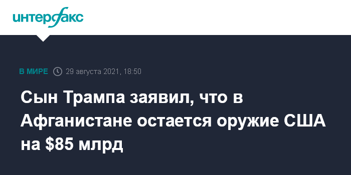 Москва. 29 августа. INTERFAX.RU - США, уходя из захваченного талибами ("Талибан" запрещен в РФ) Афганистана, оставляют там вооружений и военного оборудования на $85 млрд, написал в воскресенье в твиттере сын экс-президента США Дональд Трамп-младший.