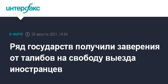 Москва. 29 августа. INTERFAX.RU - В совместном заявлении группы международных партнеров сообщается о заверениях движения "Талибан" (запрещено в РФ), что иностранцы и афганцы, имеющие разрешения соответствующих государств, смогут свободно выезжать из Афганистана.