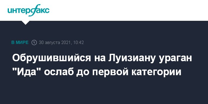 Москва. 30 августа. INTERFAX.RU - Ураган Ида, который ранее обрушился на американский штата Луизиану и нанес ему существенный ущерб, стих до первой категории, сообщает телеканал CNN.