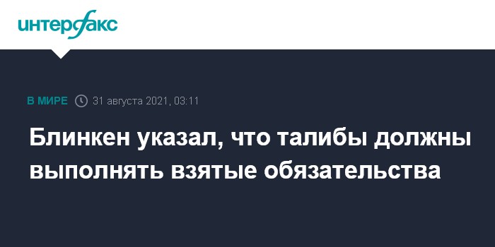 Москва. 31 августа. INTERFAX.RU - Движение "Талибан" (запрещено в РФ), пришедшее к власти в Афганистане, должно выполнять взятые на себя обязательства, чтобы их режим был признан легитимным, заявил госсекретарь США Энтони Блинкен.