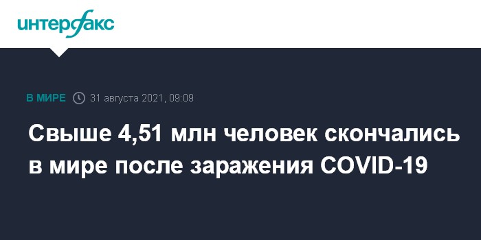Москва. 31 августа. INTERFAX.RU - Число зарегистрированных заражений коронавирусом COVID-19 в мире на утро вторника составило 217 119 281, сообщил американский университет Джонса Хопкинса.