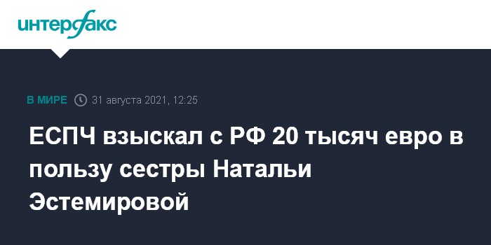 Москва. 31 августа. INTERFAX.RU - Европейский суд по правам человека (ЕСПЧ) обязал Россию выплатить 20 тысяч евро сестре Натальи Эстемировой, посчитав, что РФ не обеспечила надлежащее расследование и рассмотрение дела об убийстве правозащитницы.