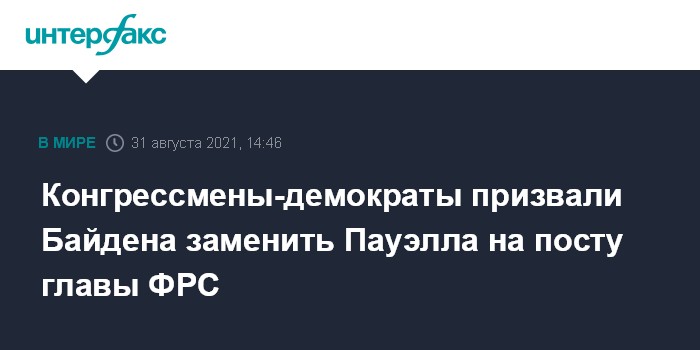 Москва. 31 августа. INTERFAX.RU - Группа конгрессменов-демократов, включая члена Палаты представителей от Нью-Йорка Александрию Окасио-Кортес, призывают президента США Джо Байдена заменить Джерома Пауэлла на посту председателя Федеральной резервной системы (ФРС) после истечения срока его полномочий в этой должности в феврале 2022 года.