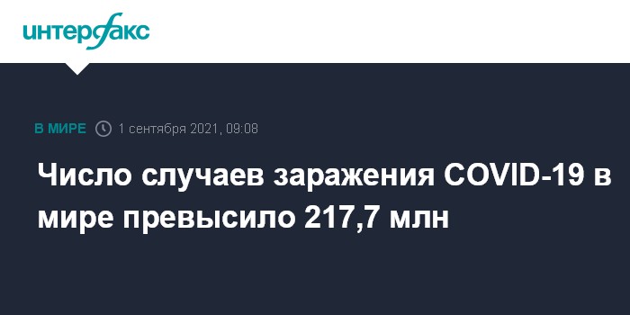 Москва. 1 сентября. INTERFAX.RU - Число зарегистрированных случаев заражения коронавирусом COVID-19 в мире на утро среды составило 217 712 392, сообщил американский университет Джонса Хопкинса.