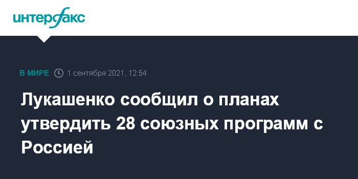 Москва. 1 сентября. INTERFAX.RU - Президенты Белоруссии и России планируют в октябре-ноябре 2021 года подписать пакет из 28 "дорожных карт" по интеграции, заявил белорусский лидер Александр Лукашенко. По его словам, это произойдет на заседании Высшего государственного совета союзного государства, передает "БелТА".