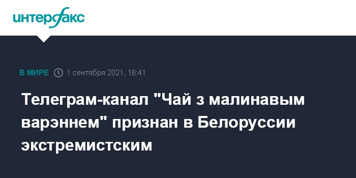Москва. 1 сентября. INTERFAX.RU - Телеграм-канал "Чай з малинавым варэннем" признали экстремистским, сообщили в среду в пресс-службе МВД Белоруссии.