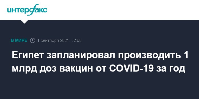 Москва. 1 сентября. INTERFAX.RU - Министр здравоохранения Египта Хала Заед заявил, что Каир намерен производить 1 млрд доз вакцины против коронавируса COVID-19 китайской компании Sinovac в год и стать "крупнейшим производителем вакцин" на Ближнем Востоке и в Африке, сообщает в среду агентство Arab News.