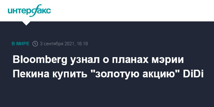Москва. 3 сентября. INTERFAX.RU - Администрация Пекина намерена купить так называемую "золотую акцию" оператора крупнейшего в Китае сервиса онлайн-заказа такси Didi Global Inc., сообщает Bloomberg со ссылкой на информированные источники.