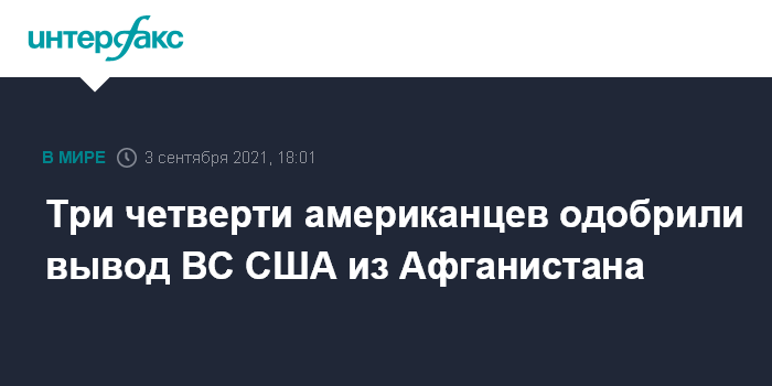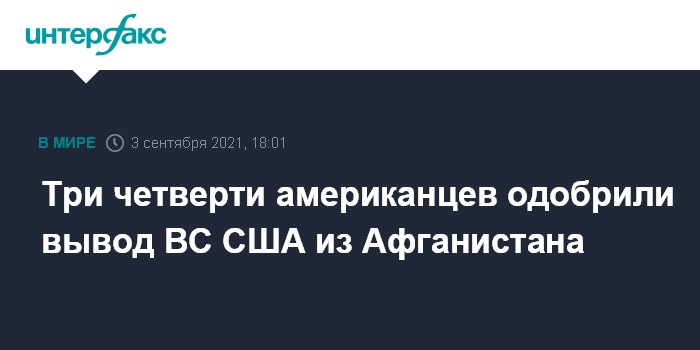 Москва. 3 сентября. INTERFAX.RU - В США 77% населения одобряют вывод американских войск из Афганистана, только 36% считают, что участие страны в афганской войне было оправданным, и 60% не одобряют то, как администрация Джо Байдена организовала уход из Афганистана и вывод беженцев, показал опрос, проведенный по заказу Washington Post и ABC News.