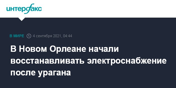 Москва. 4 сентября. INTERFAX.RU - Коммунальные службы города Новый Орлеан (штат Луизиана) планируют восстановить нарушенное ураганом "Ида" электроснабжение к середине следующей недели, сообщают СМИ со ссылками на местные власти.