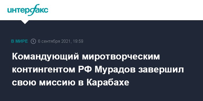 Москва. 6 сентября. INTERFAX.RU - Командующий российским миротворческим контингентом в Нагорном Карабахе генерал-лейтенант Рустам Мурадов завершил свою миссию в непризнанной республике, сообщает Минобороны Армении.