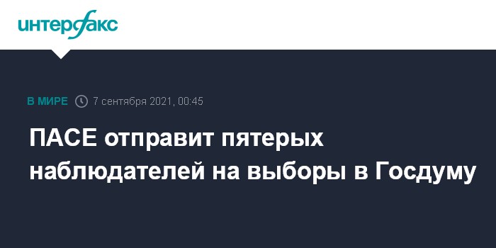 Москва. 7 сентября. INTERFAX.RU - Парламентская ассамблея Совета Европы (ПАСЕ) направит на выборы в Госдуму пять наблюдателей. Команда будет находиться в Москве с 17 по 19 сентября, такое решение приняло в понедельник, 6 сентября бюро ПАСЕ, сообщает Deutsche Welle со ссылкой на официальное заявление организации.
