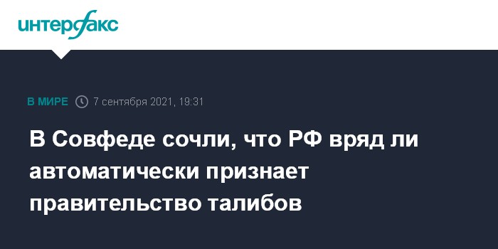 Москва. 7 сентября. INTERFAX.RU - Автоматического признания Россией сформированного движением "Талибан" (запрещенная в РФ террористическая организация) правительства Афганистана, скорее всего, не будет, оно должно продемонстрировать, что готово идти по цивилизованному пути развития страны, заявил "Интерфаксу" первый заместитель главы комитета Совета Федерации по международным делам Владимир Джабаров.
