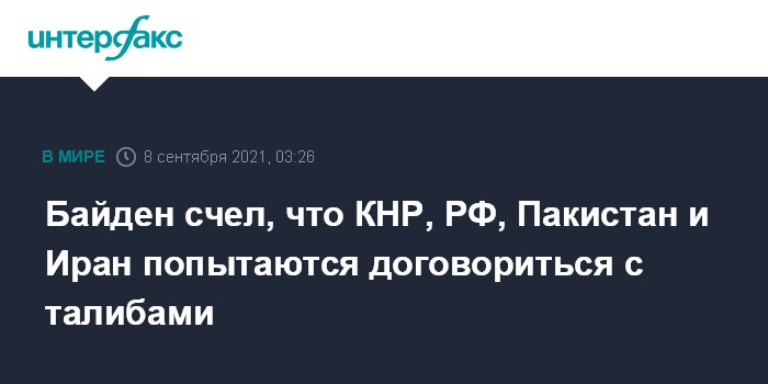 Москва. 8 сентября. INTERFAX.RU - Китай, Россия, Пакистан и Иран стремятся достичь договоренностей с пришедшим к власти в Афганистане движением "Талибан" (запрещено в РФ), заявил журналистам президент США Джо Байден.