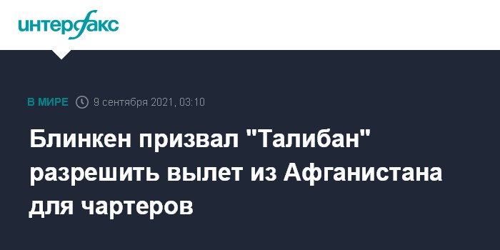 Москва. 9 сентября. INTERFAX.RU - Госсекретарь США Энтони Блинкен призвал лидеров движения "Талибан" (запрещено в России) разрешить вылет чартерных рейсов из Афганистана. Об этом сообщает Axios.