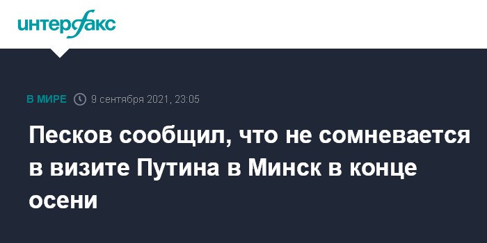 Москва. 9 сентября. INTERFAX.RU - Пресс-секретарь президента РФ Дмитрий Песков выразил уверенность в том, что визит Владимира Путина в Минск в конце осени состоится.