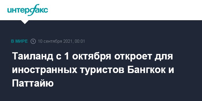Москва. 9 сентября. INTERFAX.RU - Таиланд с 1 октября планирует открыть для иностранных туристов еще ряд регионов, среди них - Бангкок, Паттайя, Хуахин и Чиангмай, сообщил на встрече с туроператорами в четверг руководитель службы маркетинга московского офиса туристического управления Таиланда (ТАТ) Константин Кинель.
