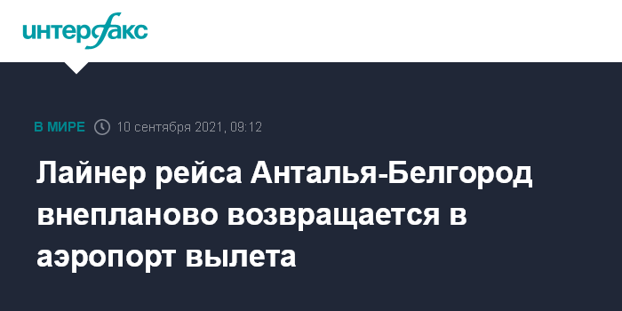 Москва. 10 сентября. INTERFAX.RU - Российский чартер, вылетевший из Антальи в Белгород, внепланово возвращается в аэропорт вылета, сообщили "Интерфаксу" в аэропорту Антальи.