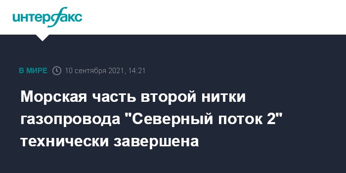 Москва. 10 сентября. INTERFAX.RU - Секции второй нитки "Северного потока 2", идущие от берега Германии и из вод Дании, в пятницу были соединены между собой при помощи надводного захлёста, сообщил оператор проекта - компания Nord Stream 2 AG.