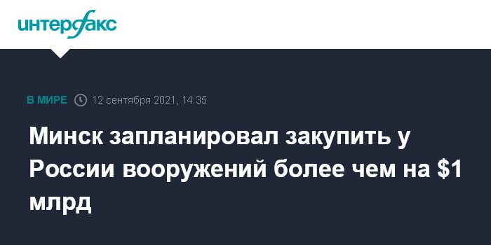 Москва. 12 сентября. INTERFAX.RU - Белоруссия планирует закупить у России вооружений более чем на $1 млрд, заявил президент республики Александр Лукашенко журналистам, посещая в ходе военных учений "Запад-2021" Обуз-Лесновский полигон под Барановичами.