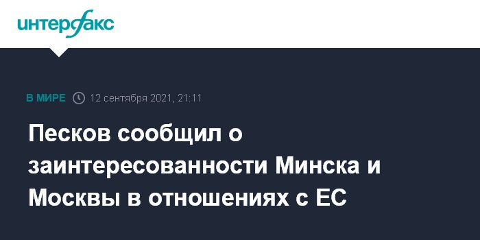 Москва. 12 сентября. INTERFAX.RU - Минск и Москва заинтересованы в отношениях с ЕС, уходе от санкций, заявил пресс-секретарь президента РФ Дмитрий Песков.