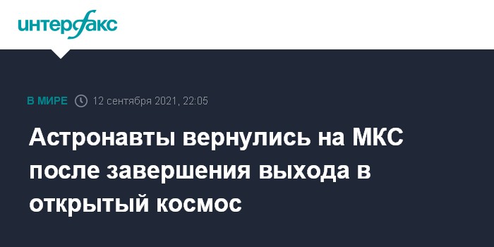 Москва. 12 сентября. INTERFAX.RU - Европейский и японский астронавты в воскресенье после продолжавшегося более шести с половиной часов выхода в открытый космос с борта Международной космической станции (МКС) для монтажных работ вернулись обратно, сообщило Национальное управление США по аэронавтике и исследованию космического пространства (NASA).