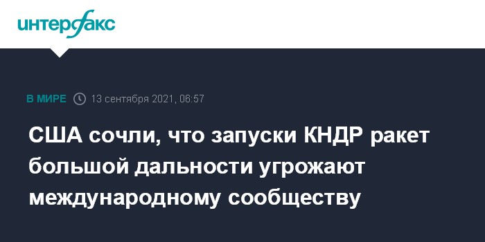 Москва. 13 сентября. INTERFAX.RU - Испытательные пуски Северной Кореи представляют угрозу для региона и за его пределами, говорится в заявлении Индо-Тихоокеанского командования Вооружённых сил США.