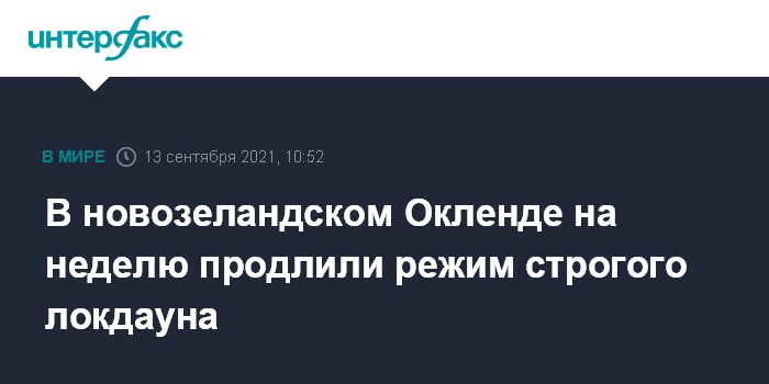 Москва. 13 сентября. INTERFAX.RU - В Окленде, крупнейшем городе Новой Зеландии, из-за распространения коронавируса COVID-19 на неделю продлили действие строгих ограничений, сообщает в понедельник новозеландское радио со ссылкой на премьер-министра страны Джасинду Ардерн.