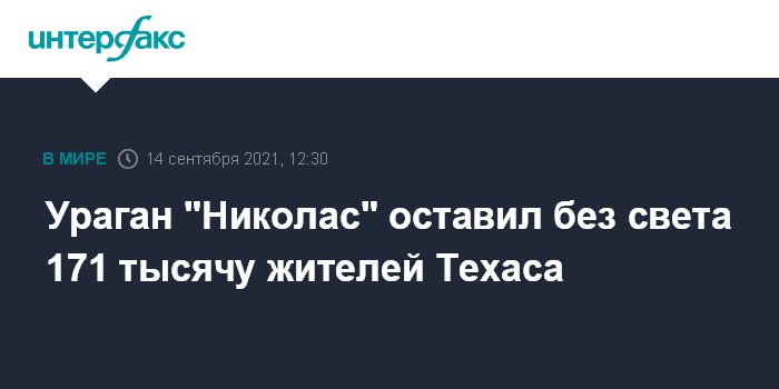 Москва. 14 сентября. INTERFAX.RU - Ураган "Николас" первой категории достиг побережья Техаса; кроме ветра, от него ждут ливней и выпадения местами до 46 см осадков, а также образования торнадо, передает АР. Ураган уже нарушил энергоснабжение в штате и оставил более 171 000 пользователей без электричества, сообщает ABC News.