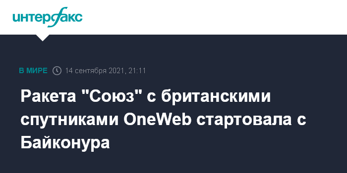Москва. 14 сентября. INTERFAX.RU - Ракета-носитель "Союз-2.1б" с 34 спутниками связи британской компании OneWeb стартовала с космодрома Байконур.