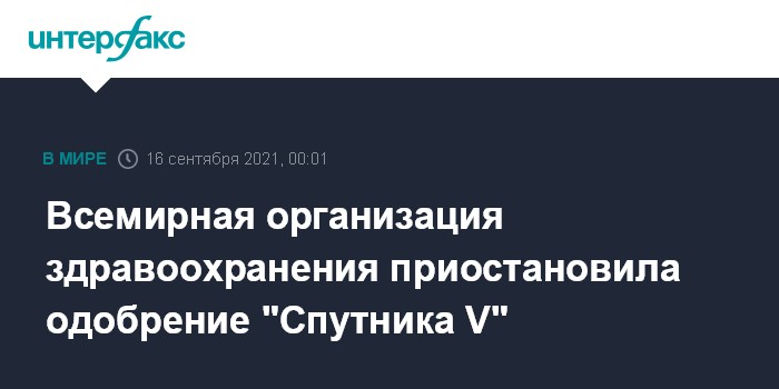 Москва. 15 сентября. INTERFAX.RU - Одобрение российской вакцины от коронавируса "Спутник V" во Всемирной организации здравоохранения (ВОЗ) приостановили до проведения новой инспекции завода производителя, cообщает газета "Коммерсантъ".