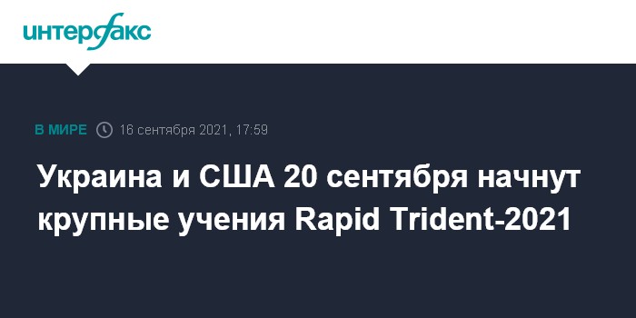 Москва. 16 сентября. INTERFAX.RU - Совместные украинско-американские военные учения Rapid Trident-2021 начнутся на Украине 20 сентября на базе Международного центра миротворчества и безопасности Национальной академии сухопутных войск имени гетмана Петра Сагайдачного.